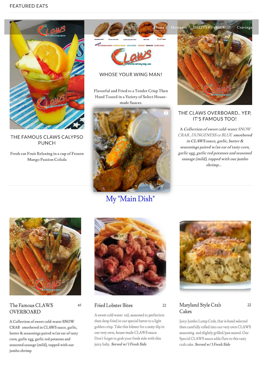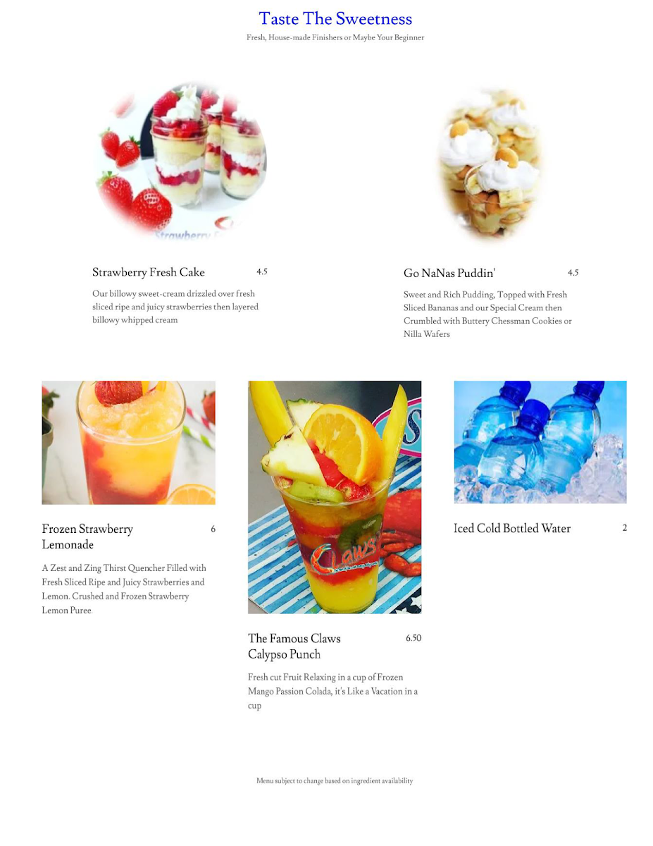 The Hooked On Claws Seafood And Wings Menu is a true celebration of coastal flavor and Southern comfort, blending the best of land and sea in a way that feels both indulgent and familiar. Every section of the menu is crafted with personality and flair, offering a balance of comfort classics and seafood favorites that speak to Tampa’s vibrant food culture. For those who like to start light, the “Taste The Sweetness” lineup offers refreshing sips and sweet endings - from the Frozen Strawberry Lemonade and Strawberry Fresh Cake to the famous Claws Calypso Punch and Go Nanas Puddin. Each treat is full of nostalgic sweetness, making it easy to cool down on a warm Florida day or wrap up a spicy seafood meal with something cool and creamy.